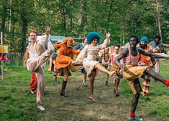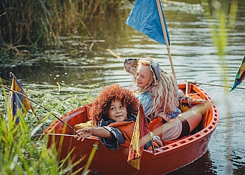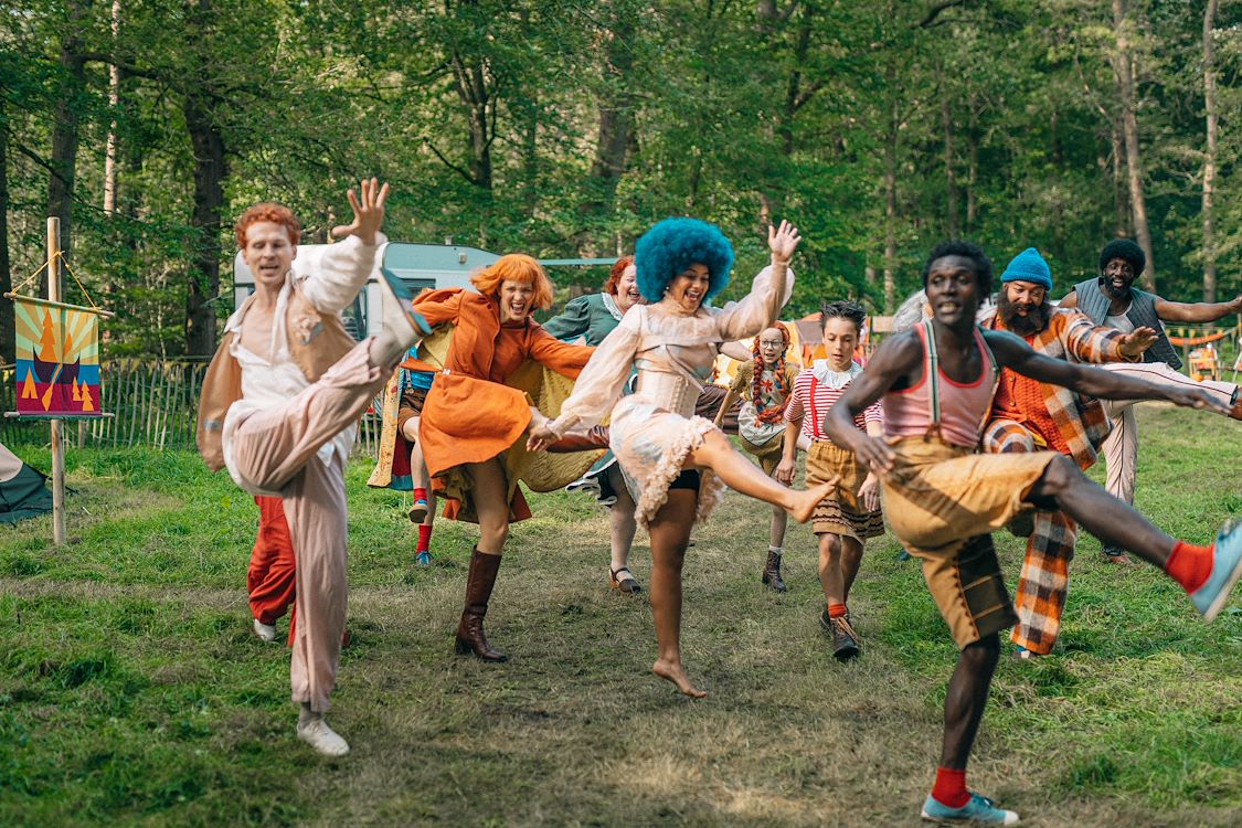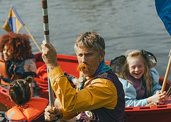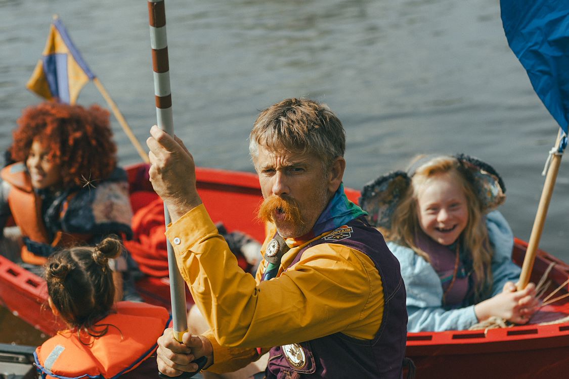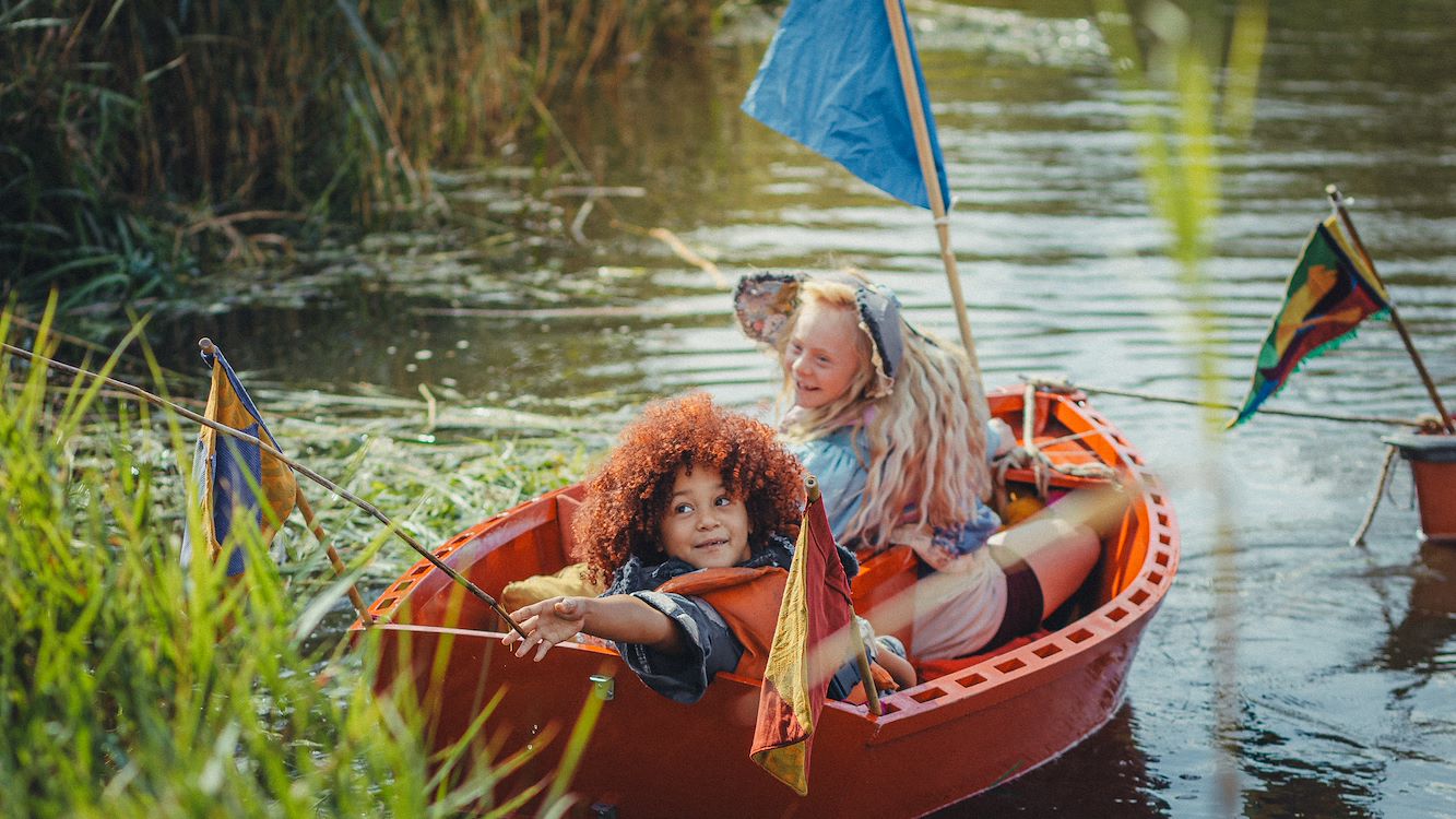 When they begin to argue, Ollie decides to find her own way home, promising to get help. Once alone in the woods, she quickly feels terribly worried about Nim, but in her anger, she hasn’t paid enough attention to the road. The search for her sister is difficult, and Ollie briefly loses faith. Just as she gives up, she’s found by Nim. Her big sister, in her own imaginative, positive, and unique way, takes over Ollie’s caregiving duties for a while. She even takes her little sister to the campsite she found all by herself. Nim gets her elephant headband from the tent, and then they can go to the party, but… do they still have time? Now it’s Ollie who, inspired by Nim’s thinking, finds a solution. They sail across the river with a group of singing scouts back to the party in the orchard.